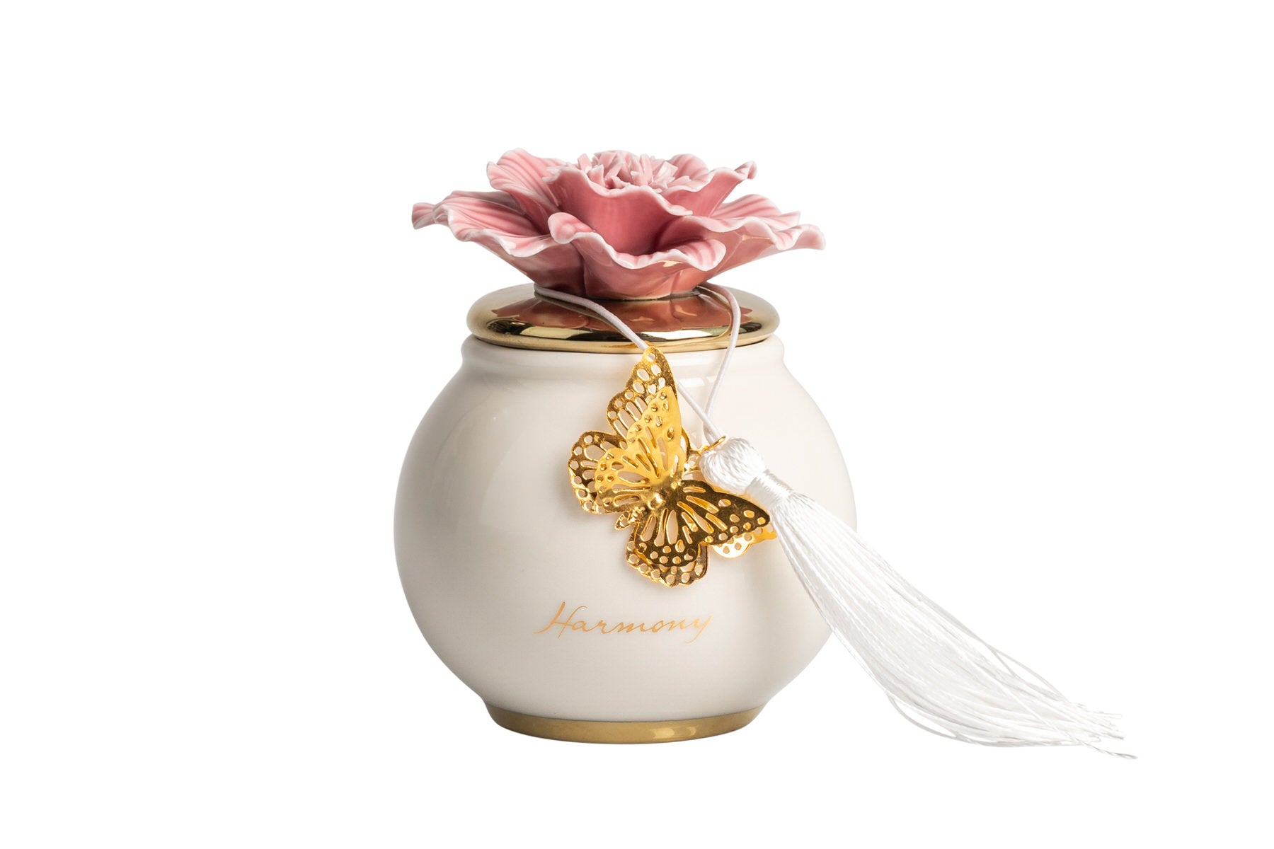 Scatola tonda porcellana bianca piccola con coperchio oro e fiore rosa con candela profumata